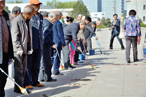 近日,定襄縣委老干局和縣老年書畫研究會組織該縣50余名書法愛好者在金鼎文化廣場開展了以“匯聚正能量、展示新精神”為主題的社會主義核心價值觀地書活動?;顒又荚诔珜?dǎo)和弘揚社會主義核心價值觀基本內(nèi)容和普及推廣“地書“文化。(張玉虎 攝)