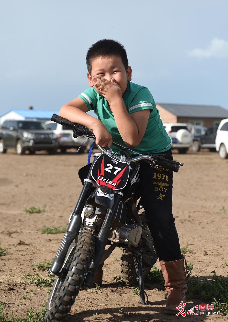 其日麥拉圖的大孫子時常會來爺爺家。對他而言,胯下的兒童玩具車就是他的“駿馬”,爺爺家的牧場就是他的后花園。圖為2020年8月2日,其日麥拉圖的孫子在牧場玩耍。(潘迪攝/光明圖片)
