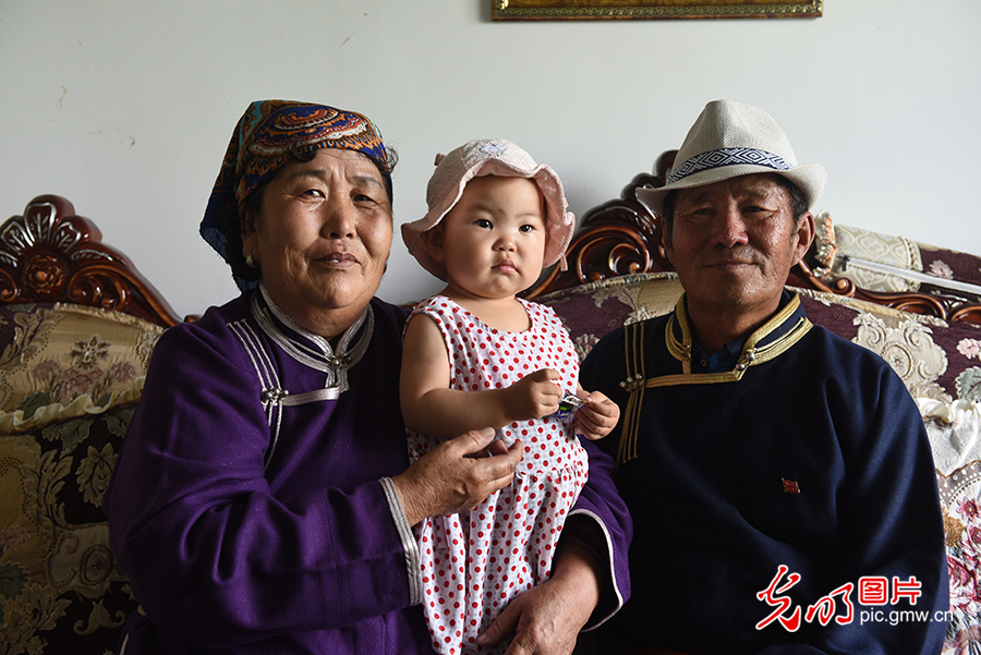 除了偶爾參加旗里的黨員活動,其日麥拉圖和老伴每日的生活就是含飴弄孫、養(yǎng)牛養(yǎng)馬,日子過得愜意又自在。圖為2020年8月2日,其日麥拉圖夫婦和小孫女在自家客廳合影留念。(潘迪攝/光明圖片)