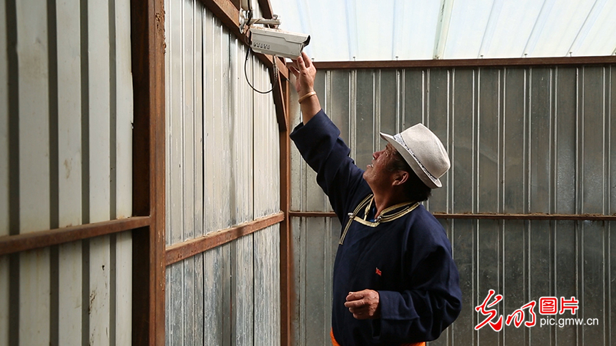 為了第一時間掌握到牲畜的情況,在其日麥拉圖的帶領(lǐng)下,許多牧民都在自家的牛舍、羊圈里安裝了監(jiān)控。圖為2020年8月2日,其日麥拉圖查看羊圈里監(jiān)控攝像頭的運轉(zhuǎn)情況。(李剛攝/光明圖片)