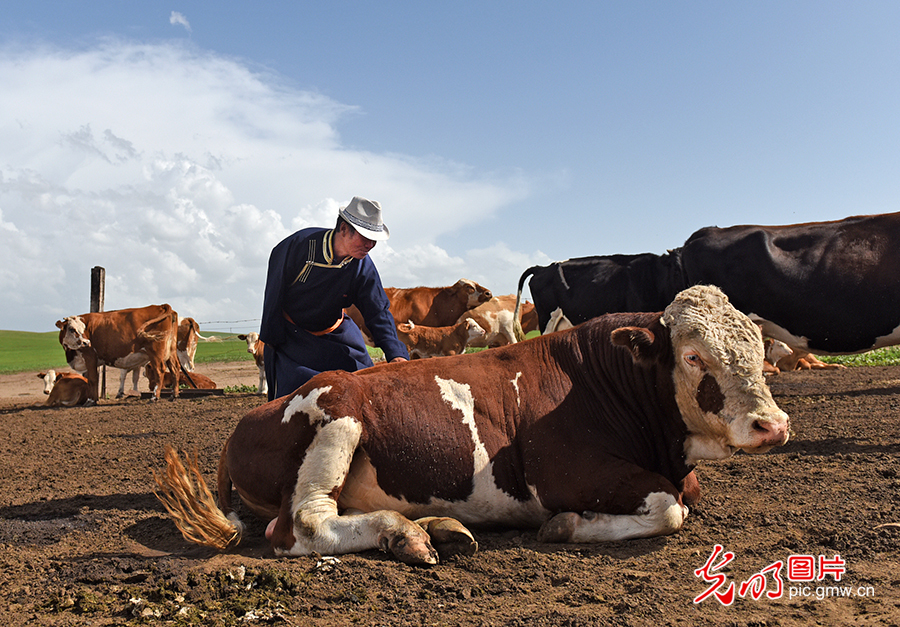 八年來,其日麥拉圖帶領(lǐng)牧民投入到嘎查牧業(yè)生產(chǎn)和生態(tài)建設(shè)中,使得牧民收入逐年提高,成為全旗機械化程度最高、疫病防治和棚圈建設(shè)最好的嘎查。圖為2020年8月2日,其日麥拉圖在查看自家養(yǎng)的牛。(潘迪攝/光明圖片)