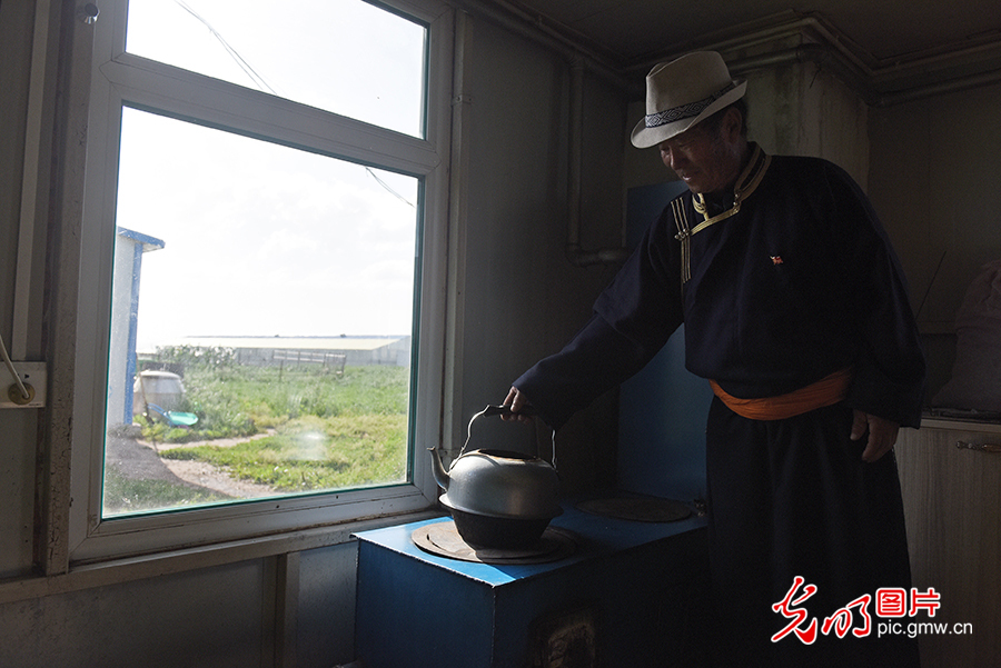 精準脫貧政策實施以來,在政府的幫助下,其日麥拉圖家在草原上蓋了新房子,生活用品一應(yīng)區(qū)全,其日麥拉圖一家逐漸擺脫了逐水草而居、隨季節(jié)而變的游牧生活。圖為2020年8月2日,其日麥拉圖在家里燒水。(潘迪攝/光明圖片)