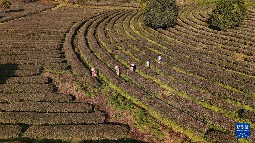 1月5日,茶農(nóng)在云南省普洱市寧洱哈尼族彝族自治縣寧洱鎮(zhèn)般海村管護(hù)茶園(無人機(jī)照片)。(新華社發(fā) 楊廷榮 攝)