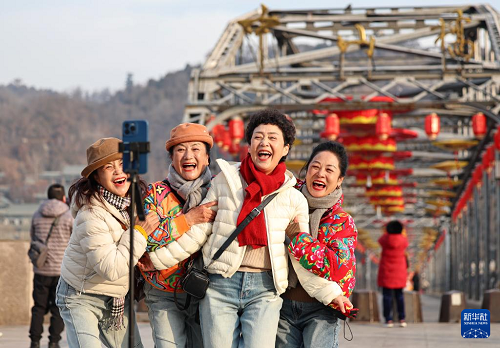 2月9日,游客在蘭州市城關區(qū)中山橋前拍照。(新華社發(fā) 侯崇慧 攝)