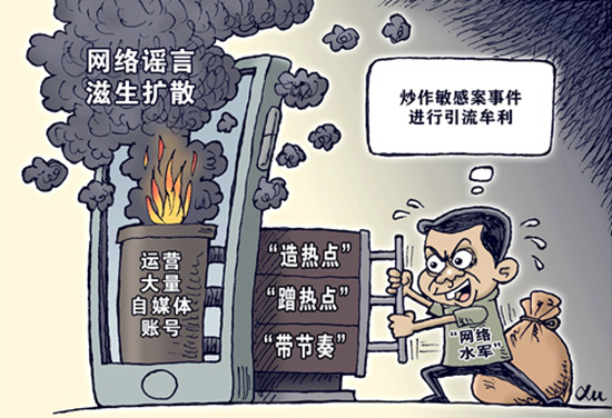 編造傳播虛假信息“造熱點(diǎn)”“蹭熱點(diǎn)”“帶節(jié)奏”,炒作敏感案事件進(jìn)行引流牟利,開設(shè)假冒媒體網(wǎng)站和自媒體賬號(hào),打著“輿論監(jiān)督”等旗號(hào),實(shí)施敲詐勒索……這些行為被公安機(jī)關(guān)嚴(yán)厲打擊。徐駿/作(新華社發(fā))