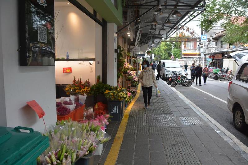 圖為2月8日記者拍攝的廈門溪岸路花鳥市場,黃色實線內(nèi)側(cè)為允許商家“適當經(jīng)營外擺”的區(qū)域。新華社記者顏之宏 攝