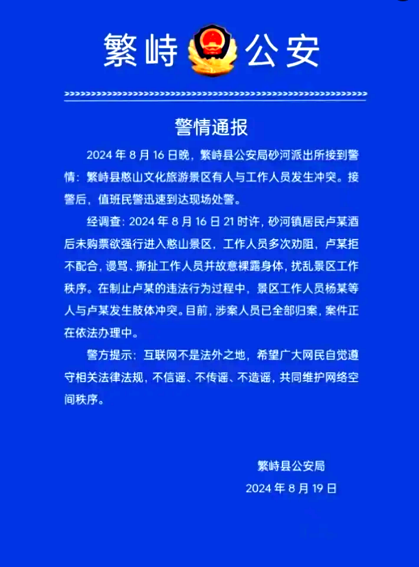 經(jīng)調(diào)查:2024年8月16日21時許,砂河鎮(zhèn)居民盧某酒后未購票欲強行進入憨山景區(qū),工作人員多次勸阻,盧某拒不配合,謾罵、撕扯工作人員并故意裸露身體,擾亂景區(qū)工作秩序。在制止盧某的違法行為過程中,景區(qū)工作人員楊某等人與盧某發(fā)生肢體沖突。目前,涉案人員已全部歸案,案件正在依法辦理中。