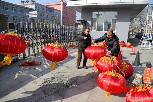 為了營造新年喜慶祥和的節(jié)日氣氛,2月4日一早,靜樂縣政府工作人員就帶上剪刀、膠帶,扛著梯子,拿著燈籠,掛起了紅紅的燈籠,向路人們表達著新年美好的祝福。圖為工作人員正在做準備工作。(閆曉梅 攝)