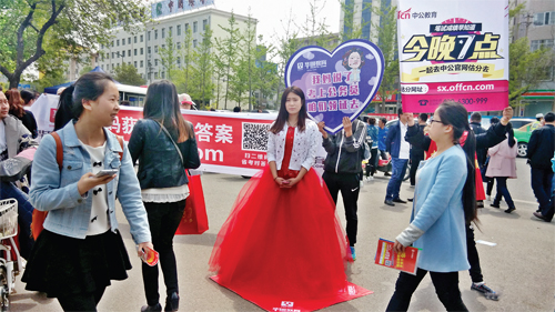 4月23日11點左右,記者在我市城區(qū)忻州一中校門口看到,一名身穿紅色婚紗裙的女生舉著牌子——“我媽說了,考上公務(wù)員,咱們領(lǐng)證去”。當天是2016年山西省公務(wù)員考試筆試的日子,這是一家公考培訓(xùn)機構(gòu)在考點附近進行宣傳活動,宣傳者靚麗的外表、婚紗裙的著裝和新奇的廣告語吸引了很多考生的目光,甚至一些路人也駐足觀看。不過,這種夸張的廣告詞,所謂的“考上公務(wù)員去領(lǐng)證”的想法是否正確,也應(yīng)該引起大家的反思。(許凈 攝)