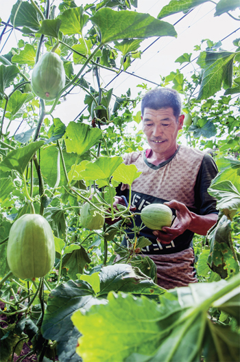 5 月14 日,忻府區(qū)部落村民在自家溫室大棚采摘甜瓜。他家種植溫室大棚甜瓜六七年了,今年采用了立體式種植甜瓜技術(shù),達(dá)到了甜瓜早上市、采摘時(shí)間長(zhǎng)的目的,成了當(dāng)?shù)胤N植甜瓜的技術(shù)帶頭人。(曹建國(guó) 攝)