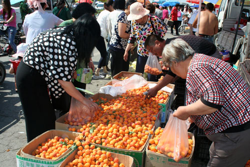 6月12日,被譽(yù)為大杏之村原平市解村鄉(xiāng)余家溝村的農(nóng)民正在集貿(mào)市場(chǎng)賣大杏,市民們正在挑選購買很受青睞。該市大力發(fā)展一村一品水果種植栽培業(yè),多措并舉促進(jìn)了農(nóng)民增收。(趙春曉 攝)
