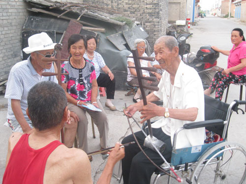 7月31日,河曲縣北元村一處街頭巷口傳出陣陣音樂(lè)和“山曲兒”聲。愛(ài)好文藝的氣象局退休人員段王鎖和村民經(jīng)常相聚街頭巷口,吹的吹,拉的拉,唱的唱,每每吸引鄉(xiāng)親們前來(lái)共享“農(nóng)家樂(lè)”。既起到了陶情怡性的作用,也給鄉(xiāng)親們帶來(lái)具有鄉(xiāng)土風(fēng)味的精神食糧。(賈金理 攝)