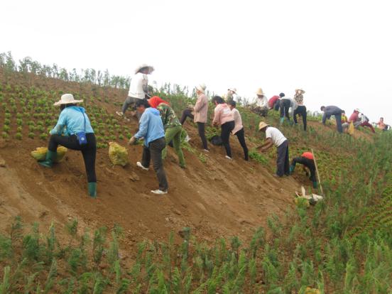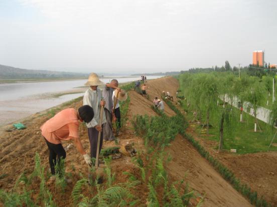 8月24日,河曲縣城北防護堤上植綠場面熱火朝天:數(shù)十名工人在堤上成排栽植爬地柏,坡面栽成菱形邊;菱形內外栽植花草“三七景天”;園林綠化車輛跟進澆水。