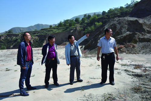 村支部何計(jì)所與鎮(zhèn)領(lǐng)導(dǎo)檢查填溝造地工程。