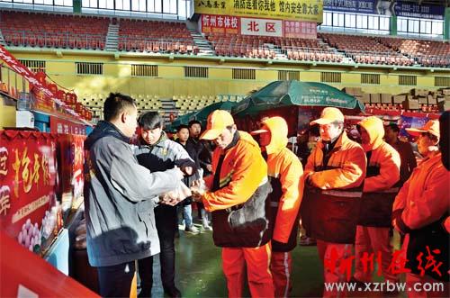 1月19日上午,山西熊奪寶網(wǎng)絡(luò)科技有限公司面向忻州市環(huán)衛(wèi)系統(tǒng)開(kāi)展“獻(xiàn)愛(ài)心迎佳節(jié)”活動(dòng),來(lái)自忻州市市容環(huán)境衛(wèi)生管理處的50名環(huán)衛(wèi)工人代表,每人領(lǐng)到了一份新鮮雞蛋?,F(xiàn)場(chǎng)的一位工作人員告訴記者:“環(huán)衛(wèi)工人們?yōu)榱顺鞘械母蓛粽麧嵏冻隽诵燎诘暮顾?,希望這些雞蛋能為他們補(bǔ)補(bǔ)身體。除現(xiàn)場(chǎng)領(lǐng)取雞蛋的50名環(huán)衛(wèi)工人之外,我市另外的1000多名環(huán)衛(wèi)工人也將陸續(xù)領(lǐng)到愛(ài)心雞蛋?!鳖I(lǐng)到雞蛋的環(huán)衛(wèi)工李大姐高興地說(shuō):“今年過(guò)年雞蛋也不用買(mǎi)了,實(shí)在是太好了!”(王菲 郭劍鳴 攝)