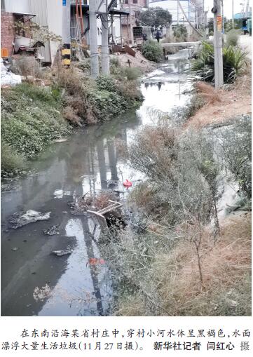 ——農(nóng)村污水治理“梗阻”現(xiàn)象調(diào)查 新華社記者 在我國廣大農(nóng)村,生活污水處置一直是人居環(huán)境整治的突出短板。記者近日跟隨國務(wù)院農(nóng)村人居環(huán)境檢查組在全國多地現(xiàn)場檢查發(fā)現(xiàn),一些村鎮(zhèn)黑臭水體問題突出,部分村鎮(zhèn)小作坊、畜禽養(yǎng)殖污水違規(guī)排放時(shí)有發(fā)生,污水治理未與農(nóng)村改廁同步銜接致大量污水直排等問題,亟待解決。 多地農(nóng)村污水直排,污染環(huán)境觸目驚心 在東南沿海某省村莊中的一座小橋上,一幅寫著“小康不小康,關(guān)鍵看老鄉(xiāng)”的巨型宣傳牌十分醒目。然而,在被廣告牌擋住的地方,水面漂浮大量的塑料袋、易拉罐、泡面盒等生活垃圾,水體呈黑褐色。