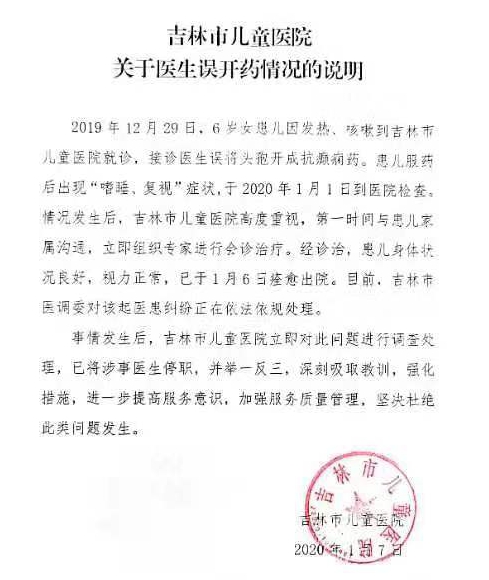 人民網(wǎng)北京1月8日電 1月7日,吉林市兒童醫(yī)院在其網(wǎng)站發(fā)布關(guān)于醫(yī)生誤開藥情況的說明稱,2019年12月29日,一名6歲女患兒因發(fā)熱、咳嗽到吉林市兒童醫(yī)院就診,接診醫(yī)生誤將頭孢開成抗癲癇藥造成患兒出現(xiàn)“嗜睡、復(fù)視”的癥狀。經(jīng)專家會(huì)診治療,患兒身體狀況良好,視力正常,已于1月6日痊愈出院。