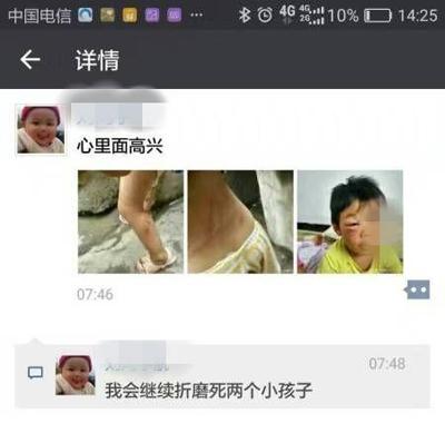 朋友圈圖片顯示:男孩受傷嚴重,眼睛被打腫,大小腿有多處傷痕。圖片轉自另一男子,最讓人覺得不可理喻的是,該男子不僅在朋友圈曬出孩子被打傷的圖片,還配文稱“心里面高興”、“我會繼續(xù)折磨死兩個小孩子”。另外還搭配自拍照稱“我曾經(jīng)說過我要死我會讓你們先死”并跟帖“從今天開始見一個殺一個”。