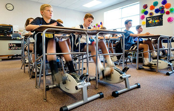 據(jù)英國《每日郵報》9月19日報道,美國北卡羅萊納州馬丁中學(xué)的美女?dāng)?shù)學(xué)老師寶芬妮· 蘭伯特(Bethany Lambeth)在課堂上發(fā)現(xiàn)學(xué)生容易開小差,精力不佳。為此,她決定在學(xué)生課桌下面安裝自行車腳踏板,一舉兩得。