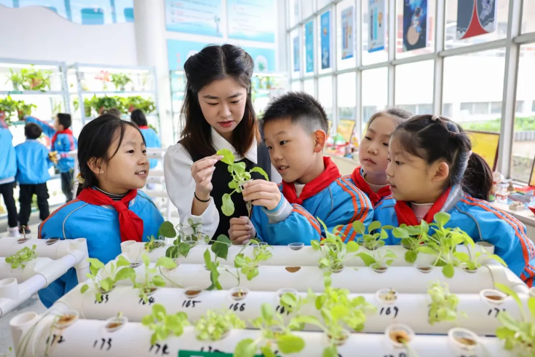 2024年11月21日,在湖北省襄陽市大慶路小學(xué)“校園農(nóng)場”,老師正在講解水培植物的相關(guān)知識。聶志鵬 付小方 攝