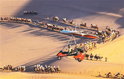 近年來,在甘肅省敦煌市鳴沙山月牙泉景區(qū)運(yùn)營的敦煌“飛天”通用航空項目,為游客提供低空飛行器旅游服務(wù),讓游客乘坐直升機(jī)、動力滑翔機(jī),從空中欣賞大漠綠洲和月牙泉美景,沉浸式體驗敦煌獨(dú)特魅力。圖為7月3日,游客乘坐滑翔機(jī)空中俯瞰敦煌大漠風(fēng)光。王斌銀攝(人民視覺)