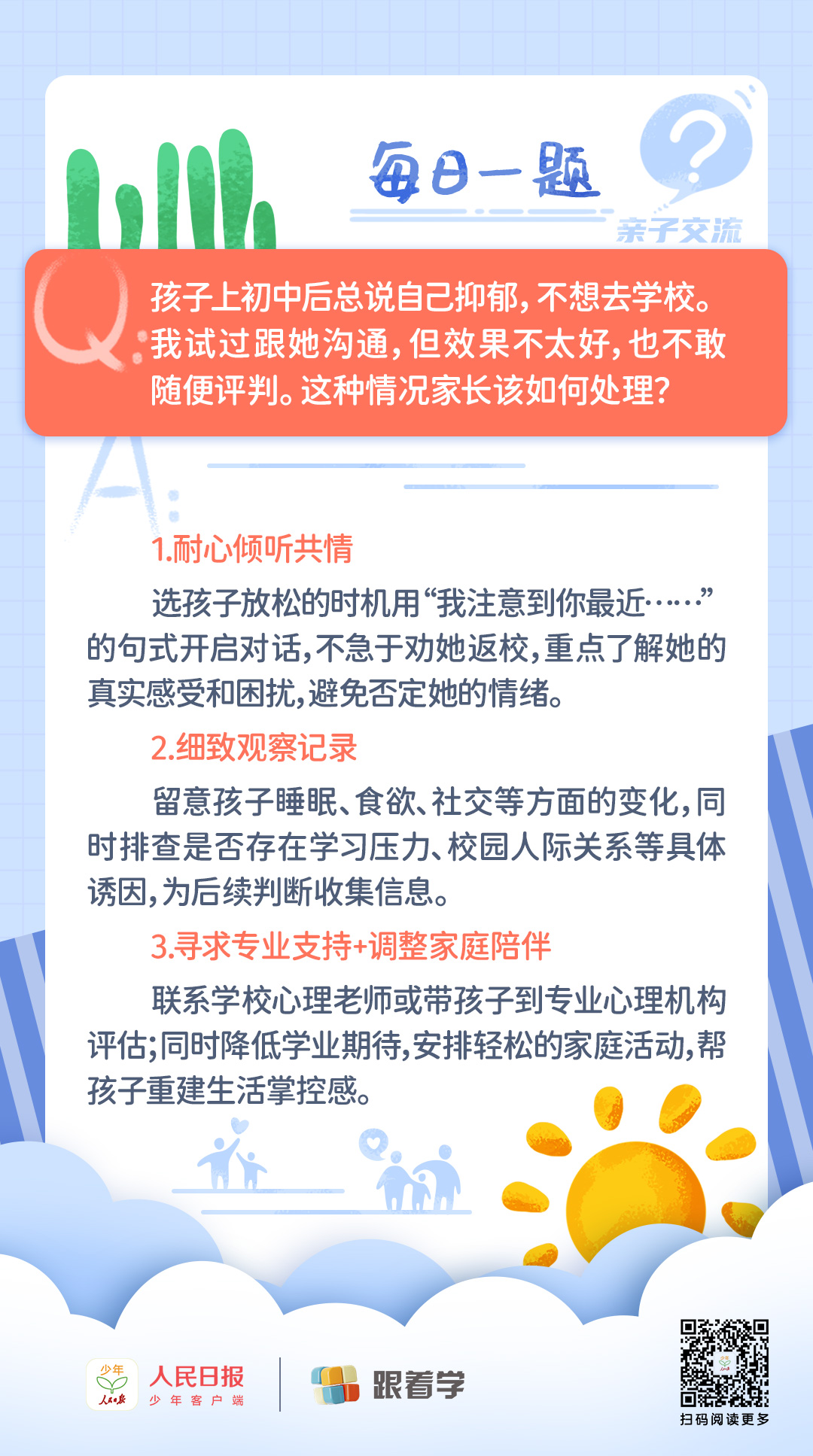 每日一題丨初中生自稱抑郁不愿意上學(xué),家長(zhǎng)該如何處理?