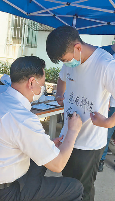 華中科技大學(xué)校史館旁,豎起一面“小清新”風(fēng)格的迎新標(biāo)語(yǔ),“愿你歷盡千帆,歸來(lái)仍是少年”,畢業(yè)生們紛紛駐足留影。在韻苑12棟樓下的遮陽(yáng)棚里,應(yīng)光電學(xué)院畢業(yè)生劉一哲的請(qǐng)求,校長(zhǎng)李元元拿起簽字筆,在其文化衫上寫(xiě)下祝福語(yǔ)。
