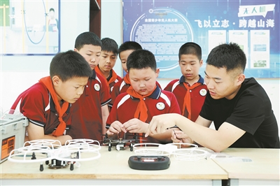 江蘇省宿遷市洋河新區(qū)實(shí)驗(yàn)小學(xué)師生進(jìn)行無(wú)人機(jī)組裝與拆卸維修。