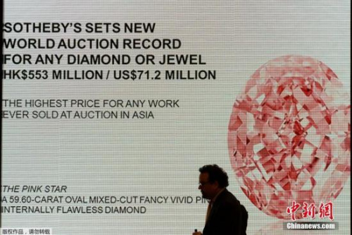 中新網(wǎng)4月5日電 據(jù)外媒報道,近日,重達59.60克拉、一顆被稱為“粉紅之星”的罕見鉆石在香港拍賣的價格超過了7100萬美元,刷新了全球鉆石的拍賣紀錄。