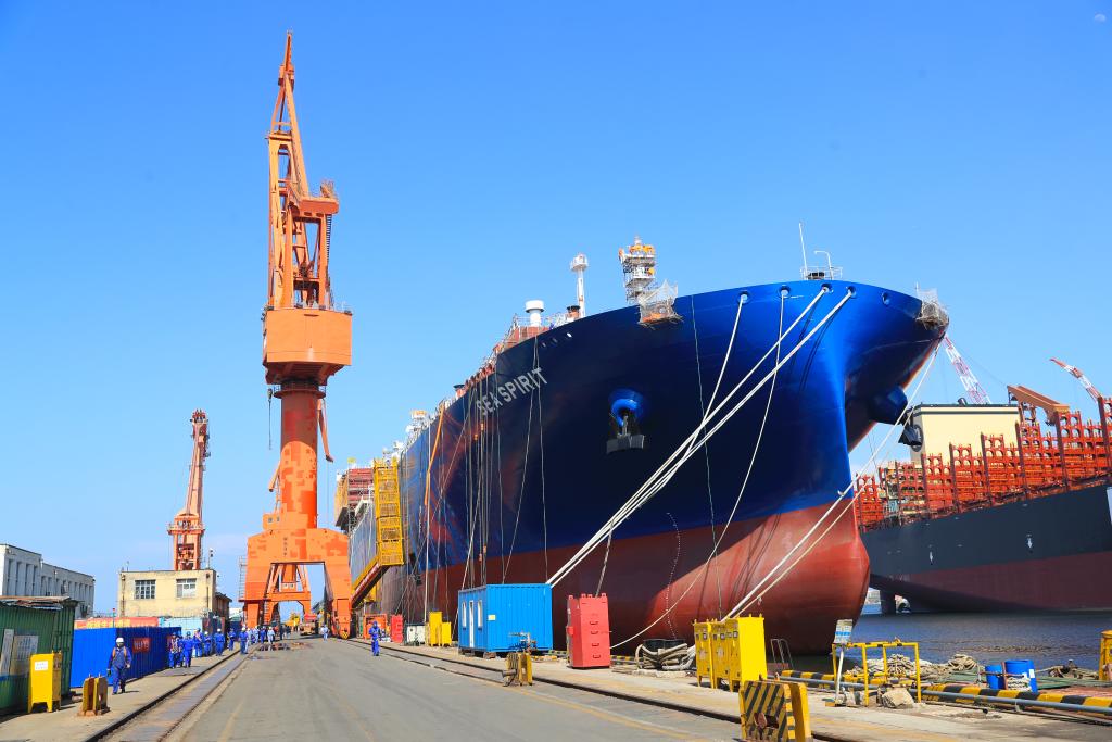 6月15日,在中國(guó)船舶集團(tuán)大連船舶重工集團(tuán)有限公司拍攝的正在建造的大型液化天然氣(LNG)運(yùn)輸船。新華社記者楊青 攝