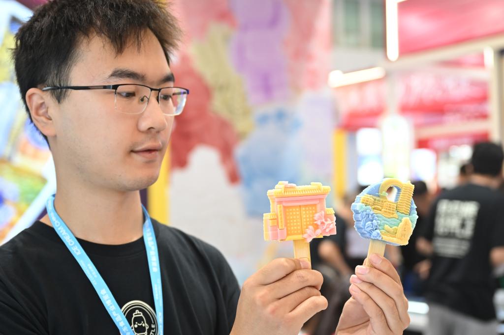 9月26日,參展商在博覽會(huì)現(xiàn)場(chǎng)展示兩款高校主題文創(chuàng)冰淇淋。新華社記者 孫凡越 攝