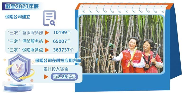 科技的運用也有效推動保險業(yè)服務(wù)農(nóng)村。中國保險行業(yè)協(xié)會發(fā)布的《保險業(yè)高質(zhì)量服務(wù)鄉(xiāng)村振興藍(lán)皮書(2024)》顯示,保險業(yè)有效提升了縣域和農(nóng)村機構(gòu)網(wǎng)點覆蓋率,截至2023年底,保險公司建立“三農(nóng)”營銷服務(wù)部10199個,“三農(nóng)”保險服務(wù)站65007個,“三農(nóng)”保險服務(wù)點363737個。2023年,保險公司在科技應(yīng)用方面累計投入資金近2.25億元,主要用于空間信息技術(shù)、AI識別、人工智能、物聯(lián)網(wǎng)等科技手段應(yīng)用,構(gòu)建農(nóng)業(yè)生產(chǎn)、風(fēng)險信息數(shù)據(jù)共享平臺。