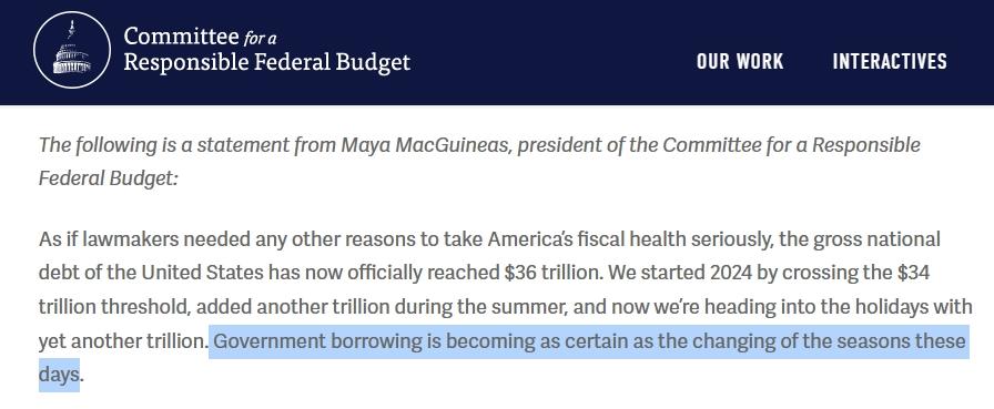 聯(lián)邦預算問責委員會主席馬婭·麥吉尼亞斯在發(fā)言稿中直言:“如今,美國政府借款正變得像季節(jié)的變化一樣規(guī)律而確定?!?/p>
