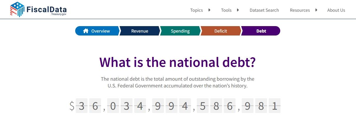 △美國財政部下屬的財務數(shù)據(jù)網(wǎng)站當前數(shù)據(jù)顯示,美國聯(lián)邦政府債務總額已達到36.034萬億美元。