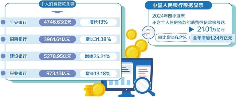 2024年,上市銀行零售業(yè)務(wù)普遍進(jìn)入調(diào)整期,消費(fèi)貸業(yè)務(wù)增長強(qiáng)勁。在擴(kuò)內(nèi)需、促消費(fèi)的背景下,消費(fèi)貸成為零售業(yè)務(wù)的新增長點(diǎn)。中國人民銀行數(shù)據(jù)顯示,2024年四季度末,不含個人住房貸款的消費(fèi)性貸款余額達(dá)21.01萬億元,同比增長6.2%,全年增加1.24萬億元。多家銀行在2024年年報中披露的個人消費(fèi)貸款數(shù)據(jù)有明顯增長。其中,平安銀行個人消費(fèi)貸款余額4746.63億元,同比增長13%;招商銀行個人消費(fèi)貸款余額3961.61億元,較上年末增長31.38%;中國農(nóng)業(yè)銀行含信用卡在內(nèi)的個人消費(fèi)貸款余額1.3萬億元,新增2943億元,增速28.3%;中國建設(shè)銀行境內(nèi)個人消費(fèi)貸款余額5278.95億元,增幅25.21%;興業(yè)銀行個人消費(fèi)貸款余額973.13億元,較上年末增長13.18%。南開大學(xué)金融學(xué)教授田利輝表示,隨著國家提振消費(fèi)政策的出臺,銀行零售業(yè)務(wù)有望逐步提速。消費(fèi)貸業(yè)務(wù)有望在政策支持下繼續(xù)增長,成為銀行重要的利潤來源。