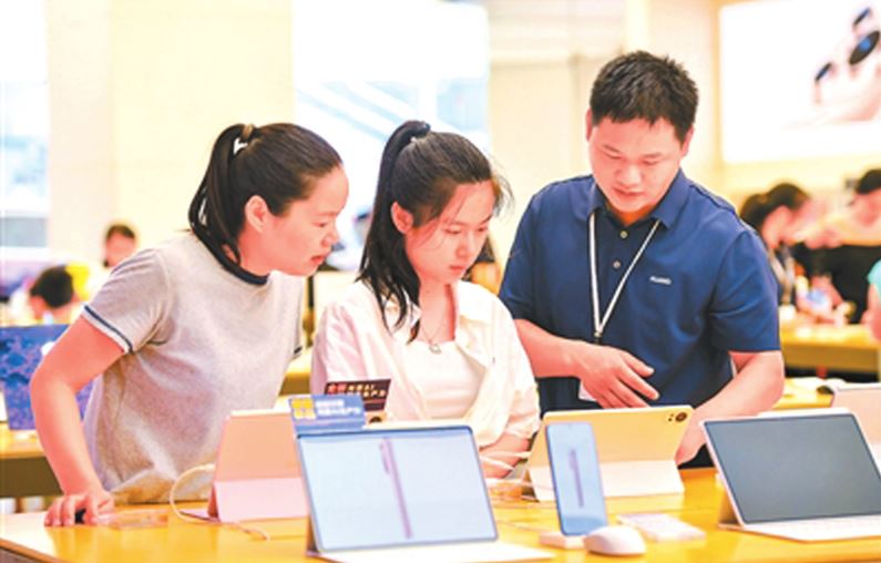 在江西省宜春市袁州區(qū)潤達(dá)國際購物中心的電子數(shù)碼產(chǎn)品專營店內(nèi),工作人員向消費者介紹平板電腦產(chǎn)品。