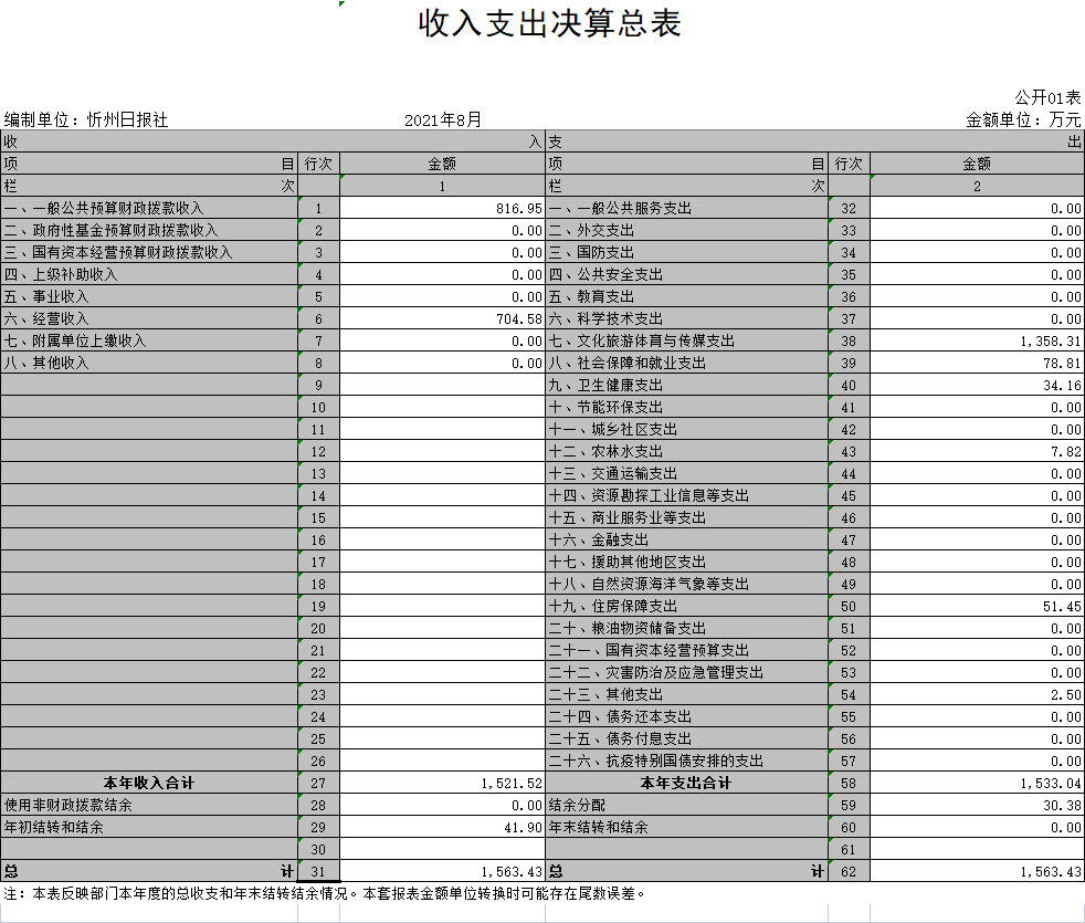 目錄 一、忻州日報社概況 (一)基本情況..............1 (二)主要職責..............1 (三)部門預(yù)算單位構(gòu)成..............2 (四)“三公經(jīng)費”預(yù)算撥款開支情況..............2 (五)政府性基金預(yù)算情況..............2 (六)機關(guān)運行經(jīng)費執(zhí)行情況說明..............2 (七)政府采購安排情況情況..............2 (八)重點項目預(yù)算的績效目標等預(yù)算績效情況說明..............3 (九)專業(yè)性較強的名詞..............3 (十)國有資產(chǎn)占用情況說明..............3 二、2020年度部門決算報表 (一)收入支出決算總表..............3 (二)收入決算表..............4 (三)支出決算表..............4 (四)財政撥款收入支出決算總表..............5 (五)一般公共預(yù)算財政撥款收入支出決算表..............5 (六)一般公共預(yù)算財政撥款支出決算明細表..............6 (七)一般公共預(yù)算財政撥款“三公”經(jīng)費支出決算表..............6 (八)政府性基金預(yù)算財政撥款收入支出決算表..............6 (九)國有資本經(jīng)營預(yù)算財政撥款支出決算表..............6 (十)部門決算公開相關(guān)信息統(tǒng)計表..............7 三、忻州日報社2020年部門決算收支情況說明 (一)收入支出各項指標與上年度對比情況及原因..........7 (二)公共預(yù)算基本支出構(gòu)成情況..........7 (三)“年末結(jié)轉(zhuǎn)情況............8 (四)政府性基金預(yù)算..............8 (五)三公經(jīng)費”預(yù)算撥款開支情況..........8 (六)政府采購情況...........8 (七)無重點績效項目.............8 一、忻州日報社概況 (一)基本情況:忻州日報社是市委直屬的全額事業(yè)單位,公益二類,正處級建制。忻州日報社全額事業(yè)單位編制66名。其中,領(lǐng)導(dǎo)職數(shù)4人,社長1名(正處),總編輯1名(正處),副社長1名(副處),副總編輯1名(副處),內(nèi)設(shè)部室16個。我社主要負責忻州日報的出版發(fā)行及忻州在線等新媒體平臺的發(fā)布運營。 (二)主要職責 1、堅持政治家辦報的方針,把握正確的輿論導(dǎo)向,圍繞中心,服務(wù)大局,著力營造推進轉(zhuǎn)型跨越發(fā)展的輿論氛圍。 2、負責全社全面從嚴治黨和意識形態(tài)陣地管理,嚴格落實意識形態(tài)責任制。 3、負責《忻州日報》、《忻州日報?晚報版》和《文化旅游》周刊的編輯出版和印刷發(fā)行工作。 4、開展網(wǎng)絡(luò)新媒體的立體傳播,負責忻州在線(網(wǎng))、微信公眾號忻州日報、忻州在線及微博、抖音、快手等平臺采編、運營和維護工作。積極推進傳統(tǒng)媒體和新型媒體的深度融合,實現(xiàn)融媒體組織機構(gòu)、采編流程、平臺建設(shè)的創(chuàng)新和重構(gòu),形成網(wǎng)上網(wǎng)下一體、內(nèi)宣外宣聯(lián)動的全媒體傳播體系。 5、圍繞“貼近實際、貼近群眾、貼近生活”,一切以為人民服務(wù)為出發(fā)點和落腳點,架起聯(lián)系群眾的橋梁,反映群眾的意見和建議。 6、完成市委、市政府和市委宣傳部交辦的其他任務(wù)。 (三)部門決算單位構(gòu)成:忻州日報社是一級預(yù)算單位,無下屬單位。部門預(yù)算只有一個單位,即忻州日報社。 (四)“三公經(jīng)費”開支情況。 忻州日報社是全額事業(yè)單位,財政只撥付人員經(jīng)費。我單位從財政撥款中沒有支出“三公經(jīng)費”,“三公經(jīng)費”數(shù)字為0,故有關(guān)“三公經(jīng)費”的內(nèi)容均為0。一般公共預(yù)算“三公”經(jīng)費支出表、“三公”經(jīng)費增減變化原因及因公出國、公務(wù)用車及公務(wù)接待等項均無數(shù)字。也沒有因公出國(境)團組數(shù)及人數(shù),“公務(wù)用車購置和運行費”為0。公務(wù)用車購置數(shù)為0,保有量為6輛,本年國內(nèi)公務(wù)接待的批次、人數(shù)為0。 (五)政府性基金決算情況:忻州日報社不涉及政府性基金,故政府性基金決算支出為0. (六)機關(guān)運行經(jīng)費執(zhí)行情況說明:因財政未給忻州日報社撥付機關(guān)運行經(jīng)費,故我單位無機關(guān)運行經(jīng)費。 (七)政府采購安排情況:忻州日報社需要走政府采購的項目都通過政府采購購買。 (八)重點項目決算的績效目標等決算績效情況說明:我單位不涉及重點項目。 (九)我單位不涉及專業(yè)性較強的名詞。 (十)國有資產(chǎn)占用情況說明:我單位沒有國有資產(chǎn)。 二、2020年度部門決算報表及2020年“三公”經(jīng)費決算表 1、2020年收入支出決算總表