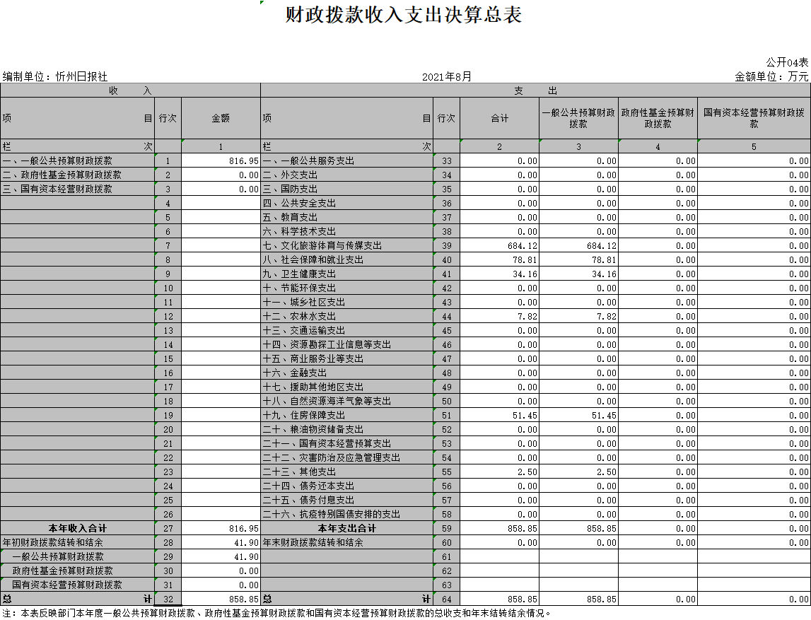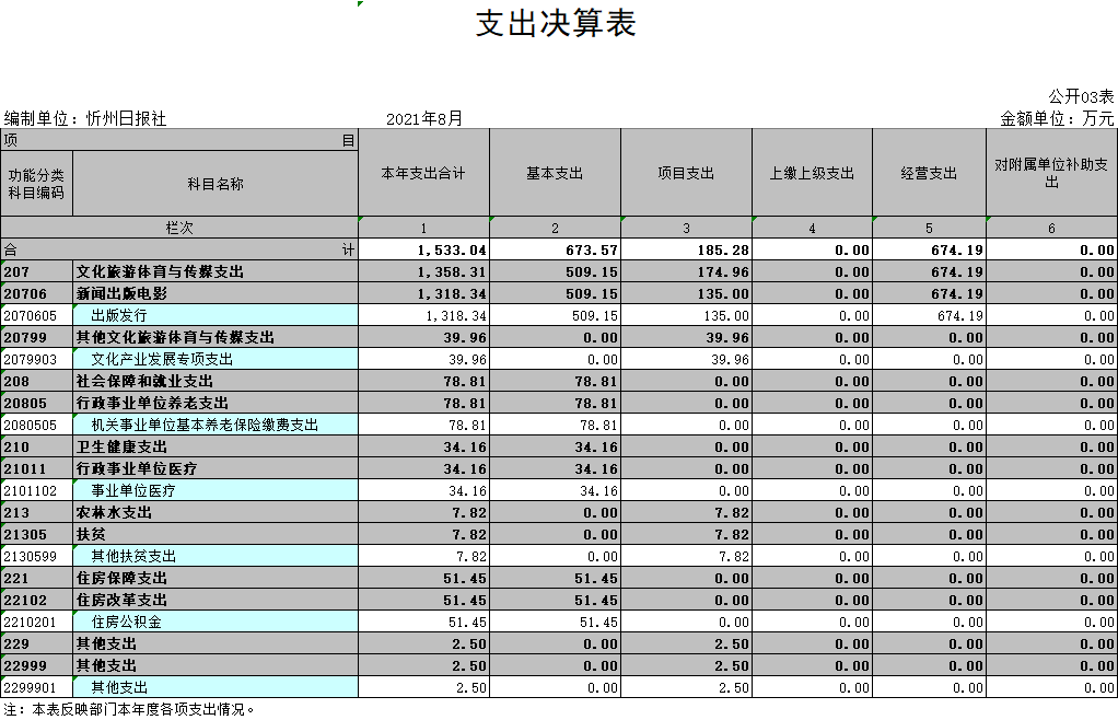 三、忻州日報社2020年部門決算收支情況說明 1、收入支出各項指標與上年度對比情況及原因:2020年一般公共預(yù)算財政撥款816.95萬元,比上年度925.65萬元,減少11.7%,原因是人員減少,專項減少;本年基本支出673.57萬元,比上年度660.25萬元,增加2%,原因為調(diào)資;本年度項目支出185.28萬元,比上年度285.81萬元,減少35.17%,原因是采編系統(tǒng)升級改造項目完成。 2、公共預(yù)算基本支出構(gòu)成情況:2020年公共預(yù)算基本支出673.57萬元,其中工資福利支出655.61萬元,商品服務(wù)支出17.96萬元。 3、年末結(jié)轉(zhuǎn)情況:本年度財政補助結(jié)轉(zhuǎn)0萬元,非財政補助結(jié)轉(zhuǎn)0萬元。 4、我單位不涉及政府性基金預(yù)算,2019年度政府性基金預(yù)算財政撥款本年收入0元,本年支出0元。 5、“三公經(jīng)費”預(yù)算撥款開支情況:忻州日報社是全額事業(yè)單位,財政只撥付人員經(jīng)費。我單位從財政撥款中沒有支出“三公經(jīng)費”,“三公經(jīng)費”數(shù)字為0,故有關(guān)“三公經(jīng)費”的內(nèi)容均為0。一般公共預(yù)算“三公”經(jīng)費支出表、“三公”經(jīng)費增減變化原因及因公出國、公務(wù)用車及公務(wù)接待等項均無數(shù)字。 6、政府采購情況:2020年我單位政府采購支出金額共75.87萬元,其中購買貨物32.02萬元,購買服務(wù)支出43.85萬元。 7、我單位2020年度決算無重點績效項目。 (責任編輯:梁艷) |
