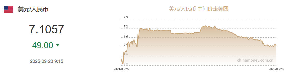 9月23日人民幣對美元中間價報7.1057元 上調(diào)49個基點