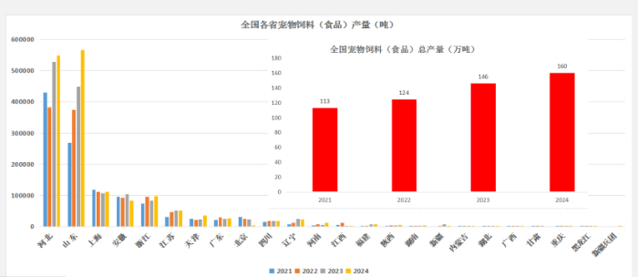 據(jù)中國飼料工業(yè)協(xié)會最新統(tǒng)計,2024年山東省寵物食品產(chǎn)量達56.6萬噸,超越河北,東北地區(qū)亦呈新興發(fā)展態(tài)勢。王宗禮稱,寵物產(chǎn)業(yè)集群效應(yīng)顯著,依托原料、區(qū)位等優(yōu)勢實現(xiàn)集群化發(fā)展。山東、河北產(chǎn)量占全國近70%,長三角占21%。
