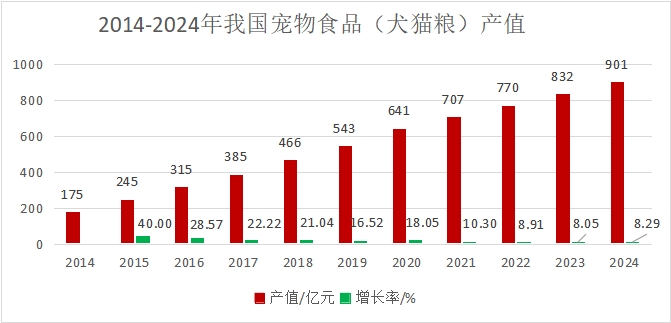 中國農(nóng)業(yè)科學(xué)院飼料研究所寵物營養(yǎng)團隊數(shù)據(jù)統(tǒng)計顯示,2024年我國寵物犬貓飼養(yǎng)量達1.4億只,寵物產(chǎn)業(yè)總規(guī)模突破3000億元,其中寵物食品市場占比最高。到2024年,寵物食品犬貓糧市場規(guī)模達到900億元,比2023年增長8.3%。