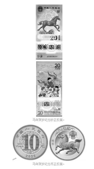 本次發(fā)行的2026年賀歲紀(jì)念幣面額10元,直徑27毫米,材質(zhì)為雙色銅合金材質(zhì),發(fā)行數(shù)量1億枚,正面為面額和年份,背面以剪紙風(fēng)格馬形象為主,輔以花燈和萱草圖案,壁面左側(cè)刊“丙午”字樣。紀(jì)念鈔面額20元,票面長145毫米,寬70毫米,采用塑料材質(zhì),發(fā)行量1億張,正面為馬造型主景,背面描繪兒童歡慶鑼鼓場景,同時融合傳統(tǒng)裝飾和多民族文字元素。二者均為我國法定貨幣,每人預(yù)約、兌換限額均為20張(枚)。