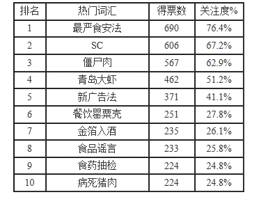 據(jù)悉,本次活動首先由食品伙伴網(wǎng)的“食品論壇”板塊網(wǎng)友針對2015年的熱門事件概括成一個關鍵詞,之后經(jīng)過整理篩選出20個候選詞匯,并于2016年1月21日-2月17日在食品論壇投票。期間共有 902位經(jīng)過審核認證的注冊網(wǎng)友參與投票,最終選出十大熱門詞匯。