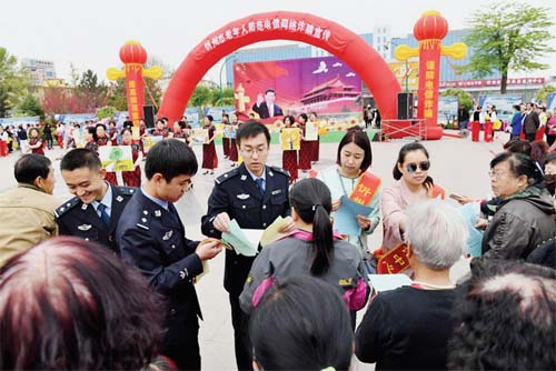 圖為公安民警在發(fā)放宣傳資料。