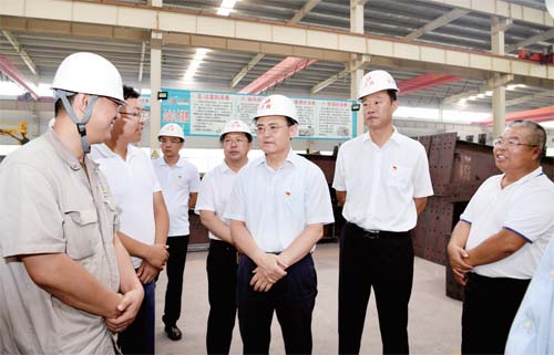 圖為省人大常委會副主任、市委書記李俊明在原平經(jīng)濟(jì)技術(shù)開發(fā)區(qū)興盛機(jī)械公司調(diào)研。(本報記者 劉紀(jì)森 攝)