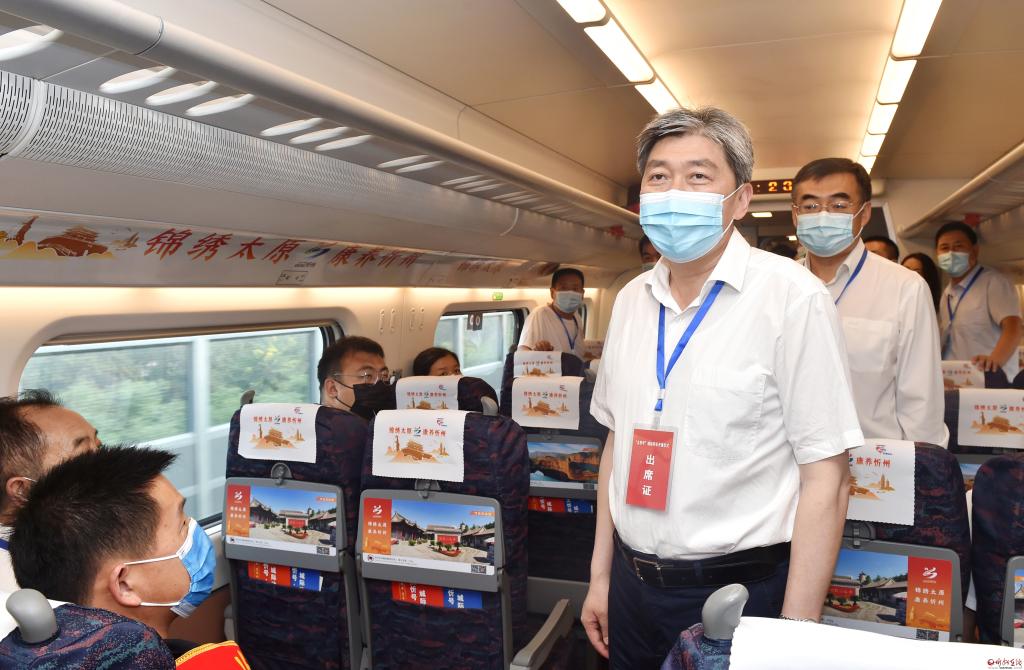 儀式結(jié)束后,朱曉東、李建國(guó)等一行共同乘坐以“錦繡太原·康養(yǎng)忻州”為主題包裝打造、冠名“太忻號(hào)”的D5306次動(dòng)車組列車返回忻州。