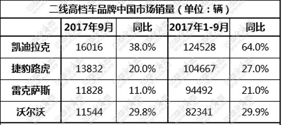 相比上月,9月的二線高檔車(chē)市似乎漲勢(shì)更甚。凱迪拉克、捷豹路虎、雷克薩斯、沃爾沃四家品牌9月銷(xiāo)量均超萬(wàn)輛,9月及前9月同比漲幅均超2位數(shù)。整體漲勢(shì)之下,二線高檔車(chē)市的排名趨勢(shì)愈發(fā)穩(wěn)定、清晰。然而,伴隨“神鋼”造假事件的不斷發(fā)酵,也為這一市場(chǎng)增添一大變數(shù)。