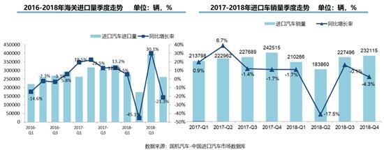 具體來看,2018年,進(jìn)口車市場供給端,海關(guān)進(jìn)口量為110.8萬輛,同比下滑8.8%;市場需求端,全年經(jīng)銷商交付客戶進(jìn)口車的數(shù)量為85.4萬輛,同比下滑5.6%。其中,2018年進(jìn)口車市場在第二、三、四季度都出現(xiàn)了巨大波動(dòng),而進(jìn)口商品關(guān)稅下降、中美貿(mào)易摩擦等因素是主因。受關(guān)稅稅率影響,二季度海關(guān)進(jìn)口量下滑45.1%,三季度,海關(guān)進(jìn)口量又恢復(fù)性增長30.1%,四季度再次出現(xiàn)大幅下滑,下滑幅度為21.3%;終端銷量走勢與之相似,二季度銷量下滑17.5%,三季度弱勢復(fù)蘇,四季度降幅擴(kuò)大至4.3%。