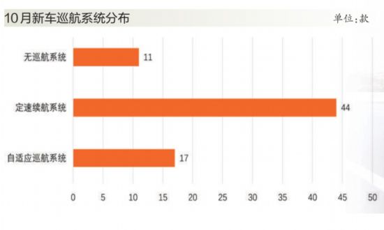自適應(yīng)巡航系統(tǒng)在緩解疲勞和保障安全上有明顯優(yōu)勢,在10月上市車型中,搭載該系統(tǒng)的新車有17款,如新款東風(fēng)日產(chǎn)天籟、一汽豐田榮放、長安CS35、WEY VV5、吉利遠(yuǎn)景X6以及理想ONE等車型,均搭載有自適應(yīng)巡航系統(tǒng),甚至是全速自適應(yīng)巡航系統(tǒng)。與以往相比,自適應(yīng)巡航技術(shù)的滲透率有所提升,而定速巡航的應(yīng)用則更為廣泛,在各級別車型中均有分布。10月,搭載定速巡航的新車總數(shù)為44款,而不搭載任何巡航系統(tǒng)的車型共有11款,主要體現(xiàn)在定位較低車型上。