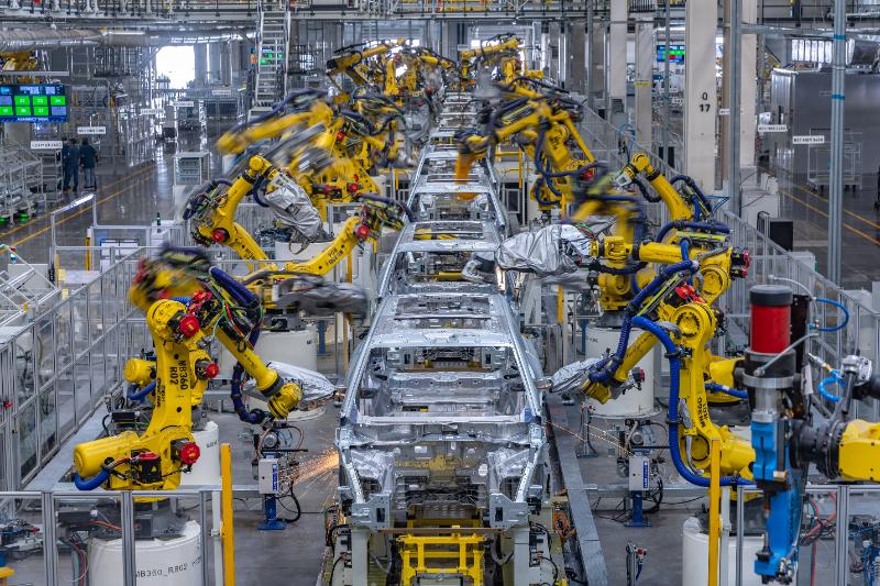 (資料圖片)在位于重慶兩江新區(qū)的賽力斯超級(jí)工廠,焊裝車間生產(chǎn)線上的機(jī)器人在精準(zhǔn)執(zhí)行作業(yè)指令。新華社記者 黃偉 攝